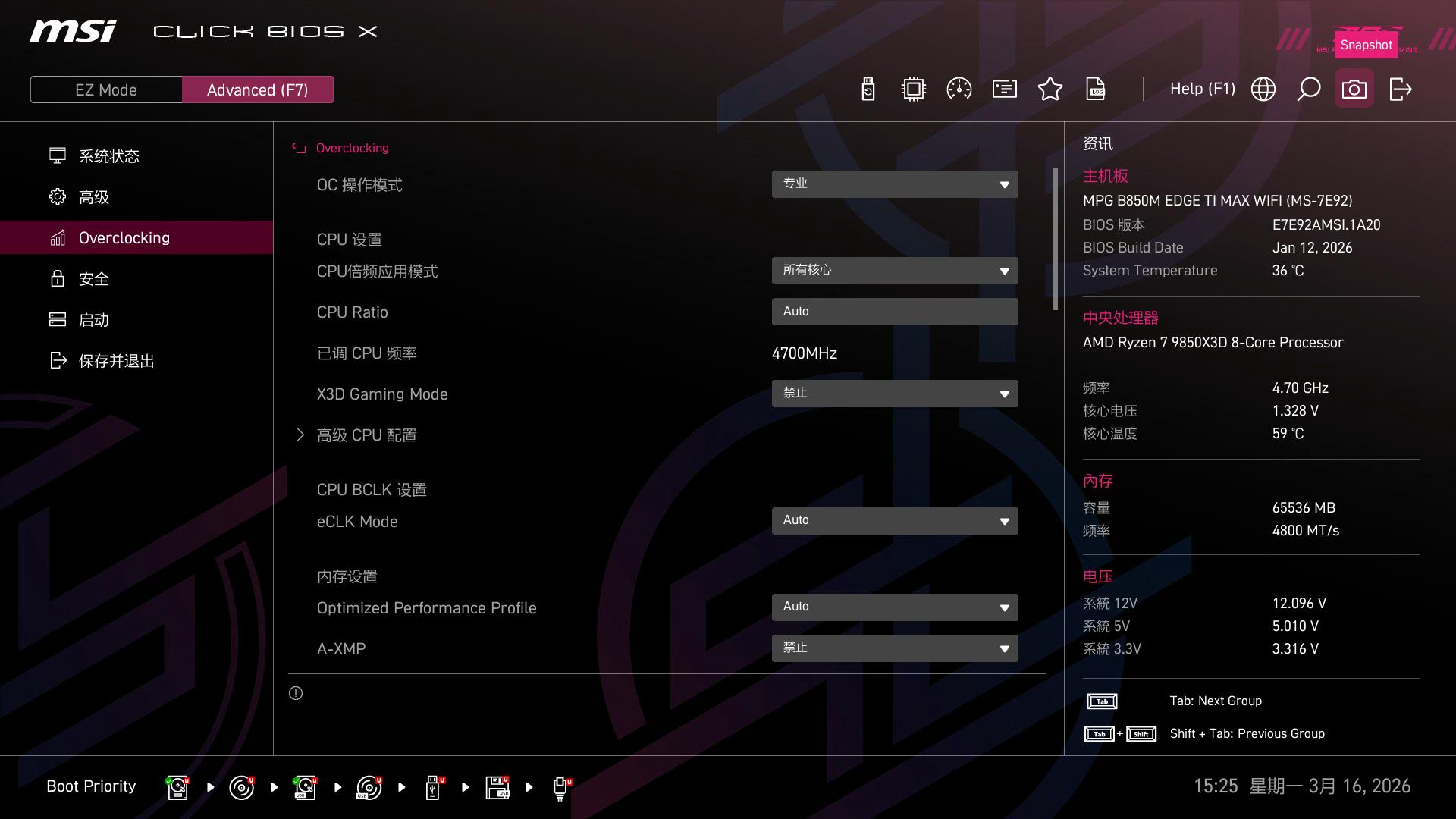 按F7切换至Advanced高级模式,这里保留了微星传统的分级菜单逻辑,但布局更清晰。例如,超频选项集中在“OC”菜单下,内存时序调节、电压曲线优化等功能分类明确,适合进阶用户。