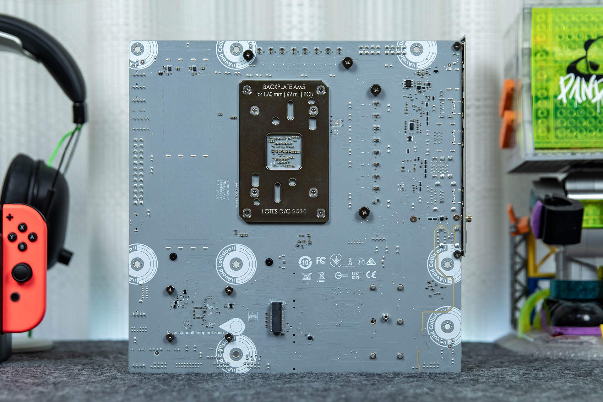 主板背面的焊点处理的很工整,CPU位置有一块防护钢板,8个安装螺丝孔和1个重点走线区域进行了特别标注,印有“Case standoff keep out zone”字样 ,提醒用户在安装时要特别留意此处不能挤压、碰撞,避免损伤电路。