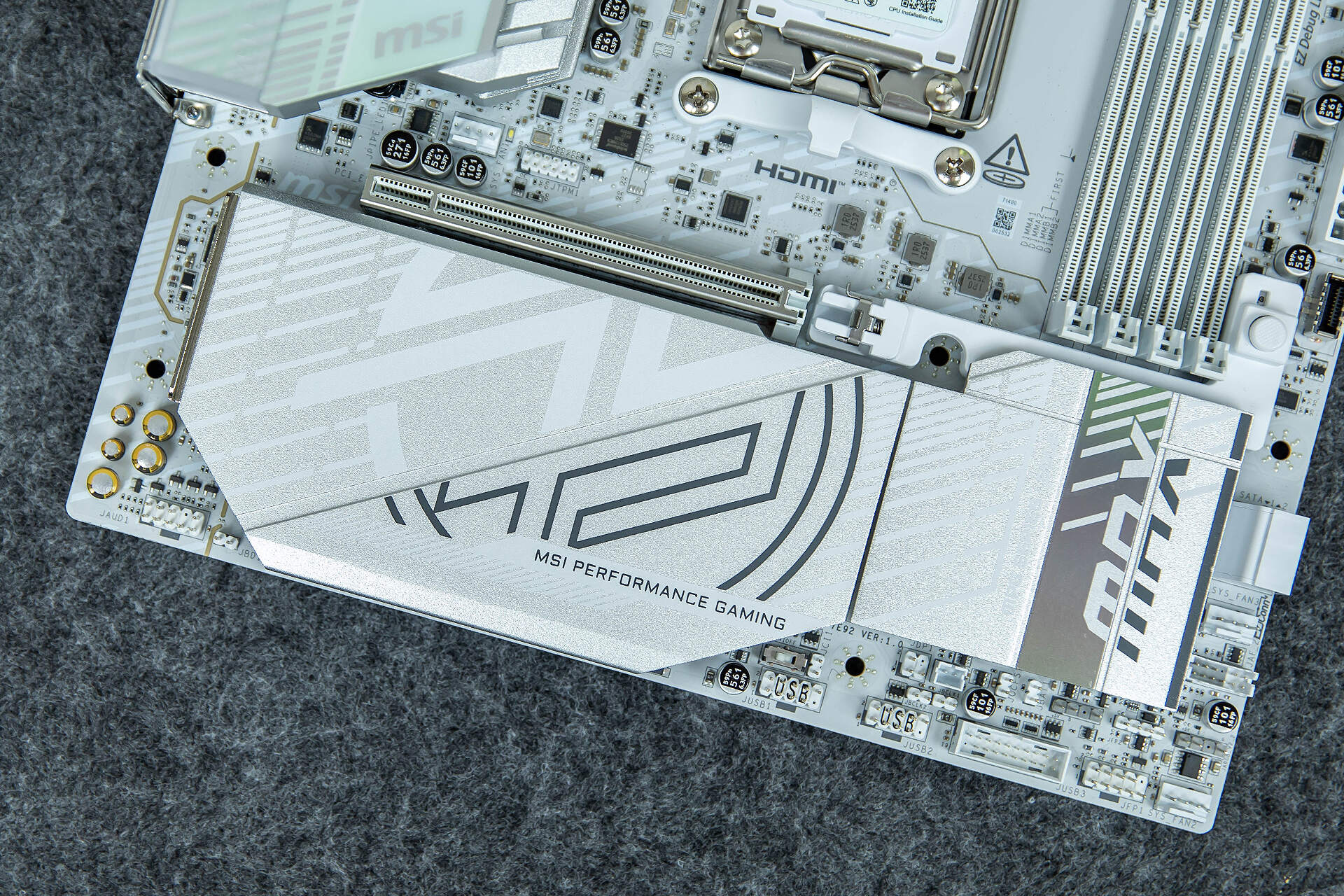 应该是综合考虑了PCIe 5.0 SSD的发热量和尺寸限制问题,MPG B850M EDGE TI MAX WIFI刀锋钛为正面的3个M.2插槽配备了一块硕大的M.2冰霜铠甲,能有效避免SSD因温度过高而出现降速问题。