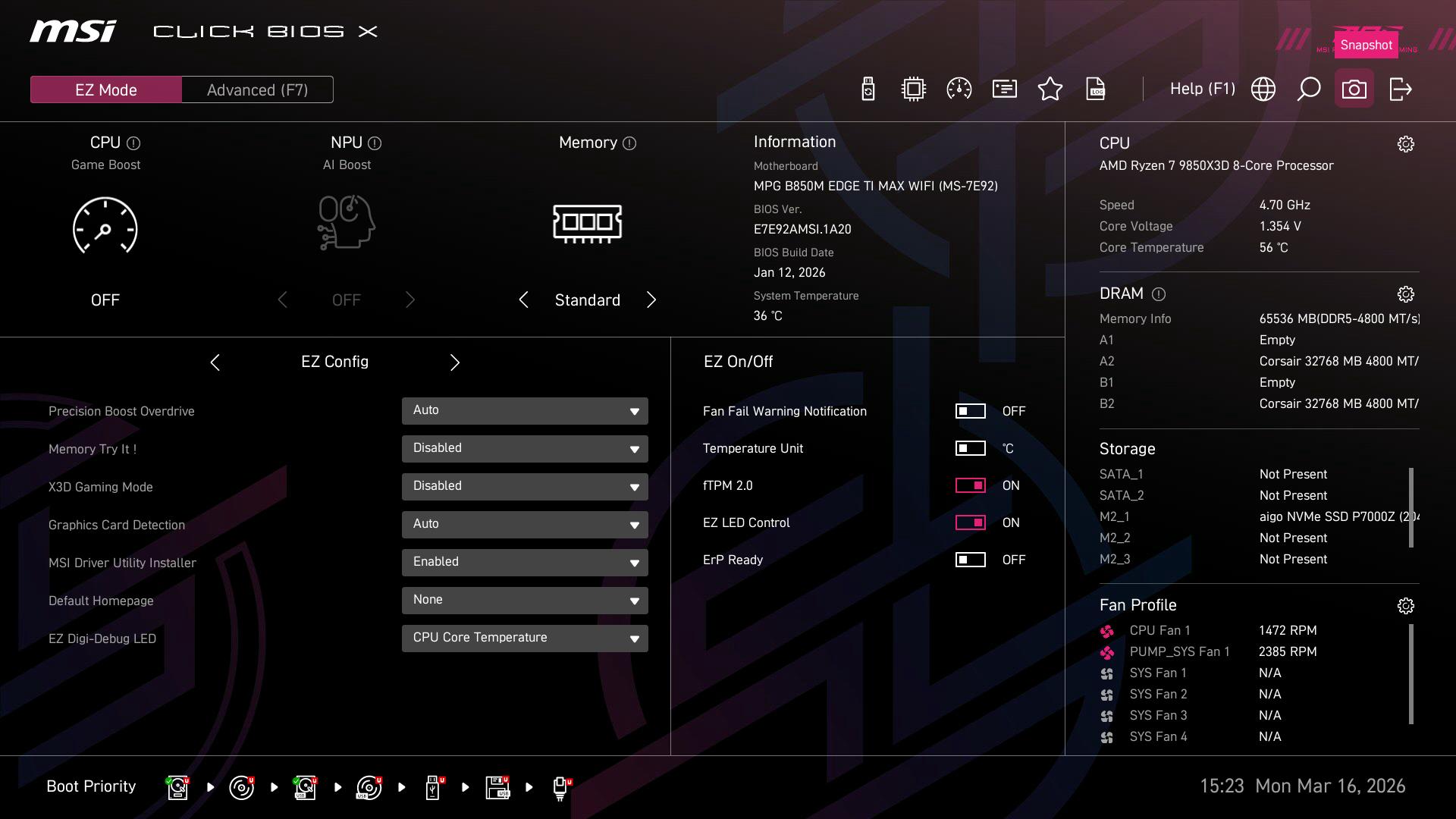 EZ Mode界面的上半部分集成了CPU Game Boost(CPU一键超频)、NPU AI Boost(NPU一键加速)、Memory(内存一键超频)三大功能,无需深入子菜单即可快速调整核心设置,适合新手和小白用户。