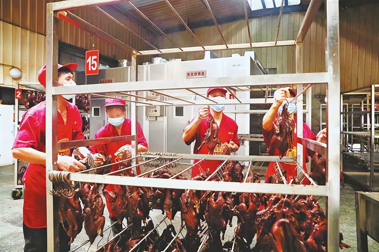 梁平真本味食品有限公司生产车间,工人将卤制后的鸭子挂上烤架 摄/向成国
