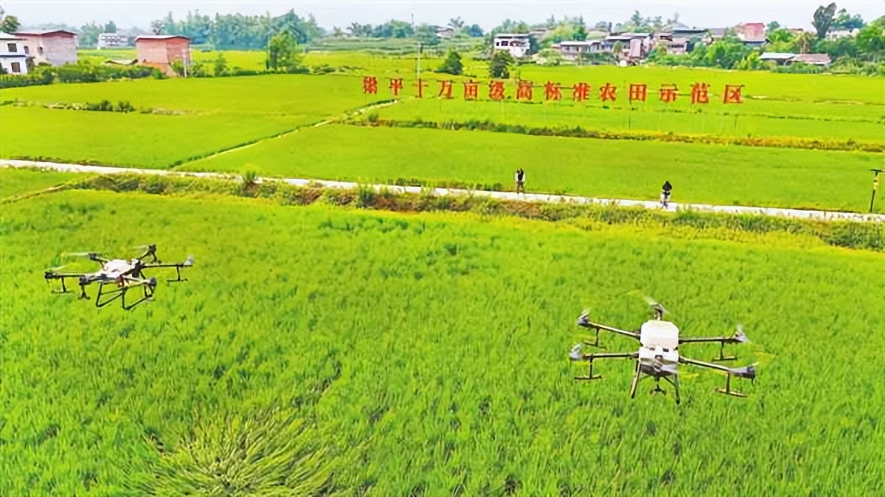 星桥镇两路村,无人机飞手操作植保无人机为水稻进行施肥、喷药作业 摄/刘辉