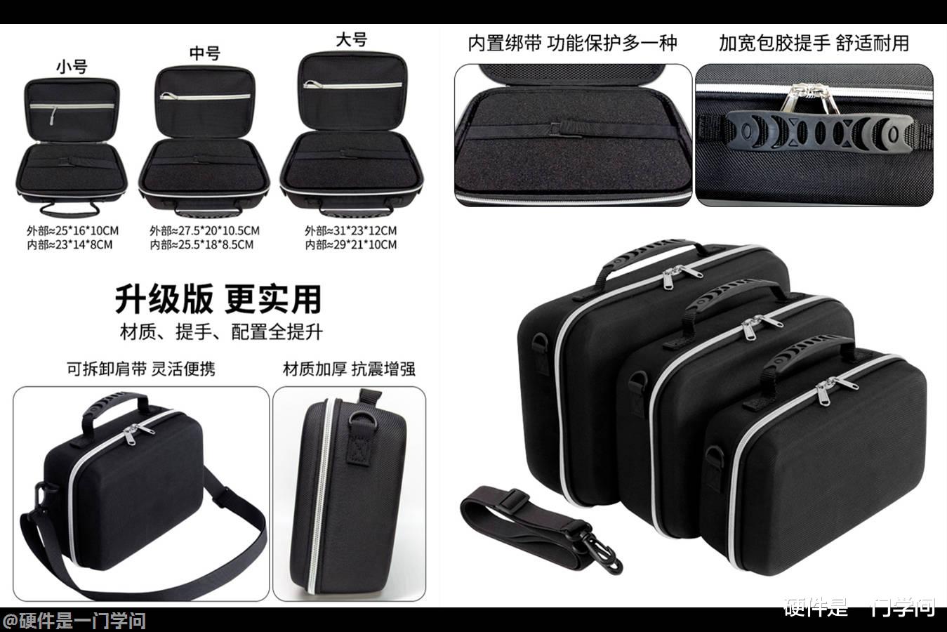 为了方便携带,我这几天一直在网上淘收纳包。由于主机尺寸比较特殊,高度偏高,很难找到合适的,后来找到了一个比主机更大的包,上图的B款,内部填充了自由格海绵,价格不到50元,可以DIY收纳格,这样主机和其他附件都可以收纳在里面了。