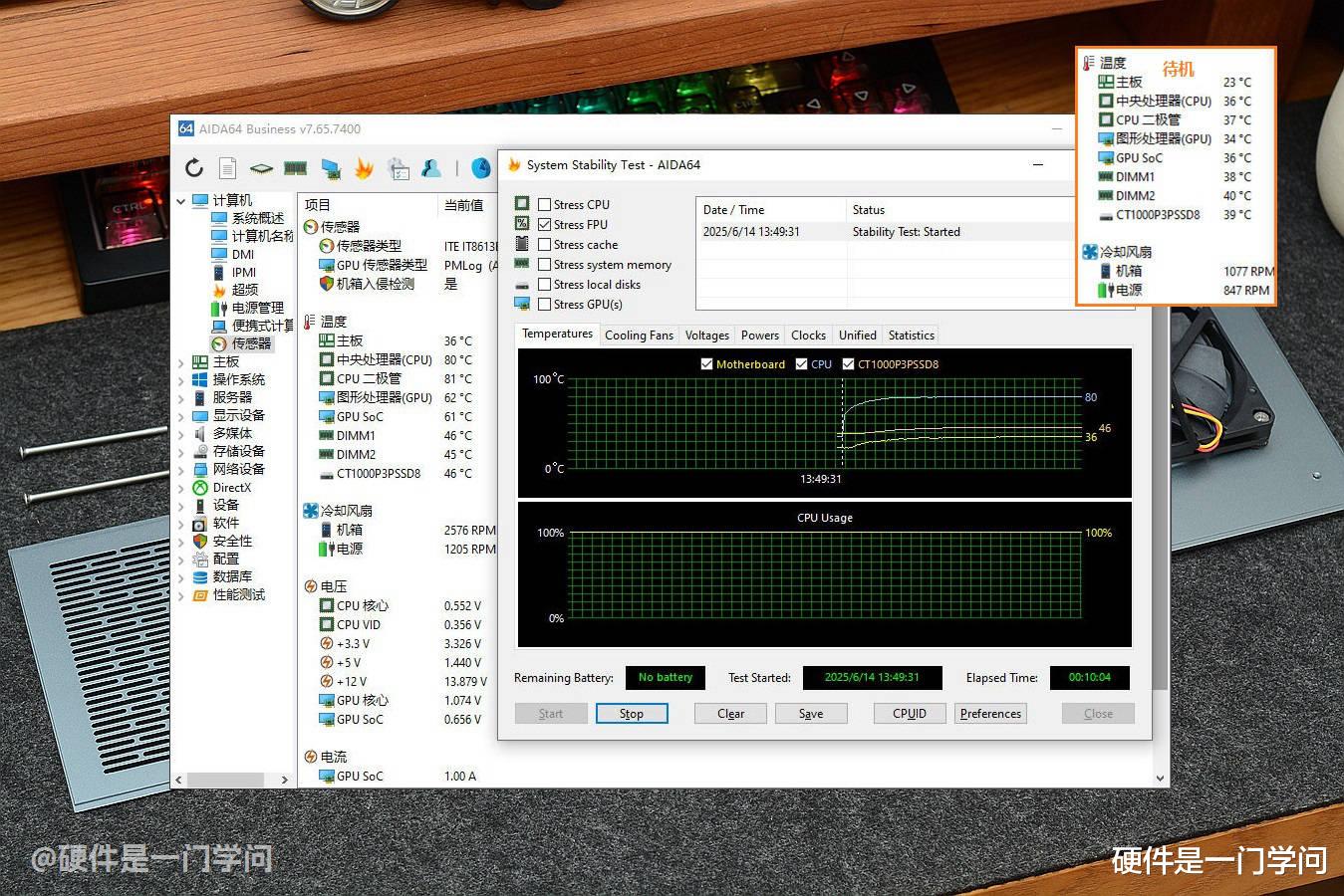 AIDA64单烤FPU测试,室温30℃的情况下,运行了10分钟,CPU没超80℃,主板36℃,硬盘46℃,待机时,CPU36℃,主板23℃,硬盘39℃,温度控制的还是比较给力的。