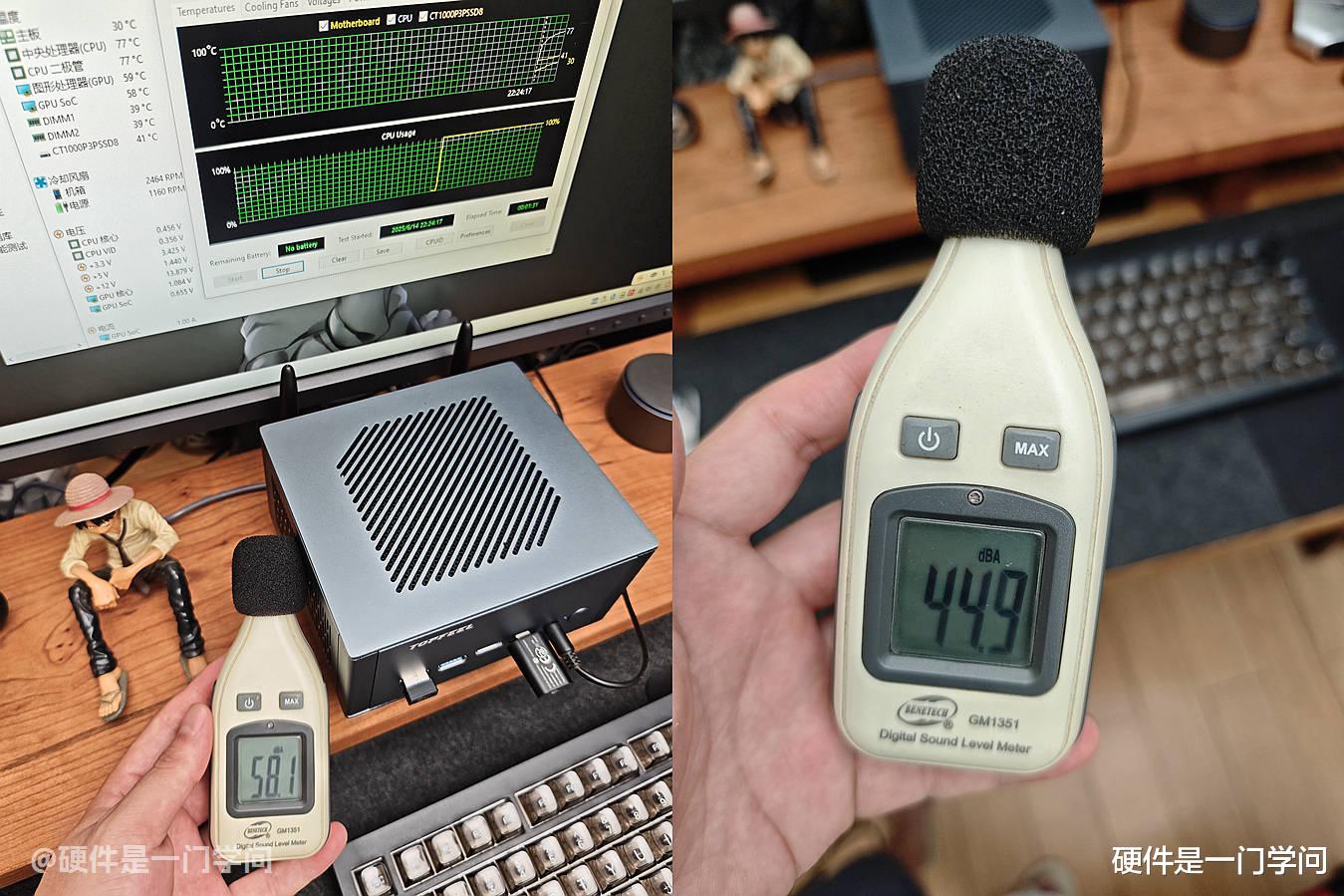 单烤FPU时,贴紧出风口噪音值约为58dBA,相对待机提升了13dBA,默认正常坐姿,远离30-40公分时再测,噪音约为45dBA,跟待机噪音数值差不多大。再次强调一下,这个噪音数值只针对我这个环境,我个人的感受是噪音控制的的还是不错的。