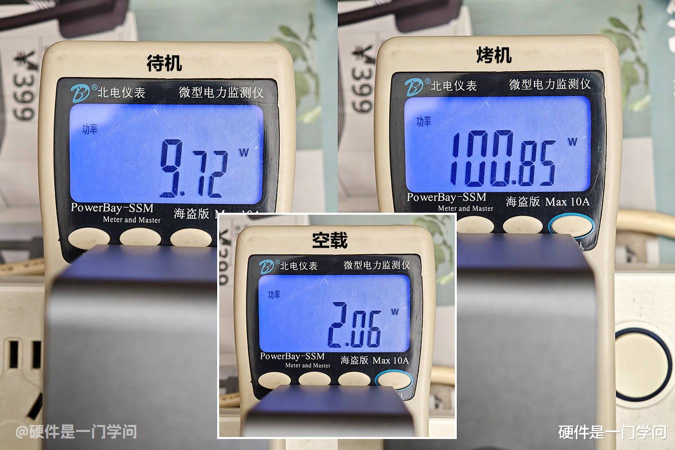 功耗测试,关机空载时功耗约2W,开机待机时功耗9W左右,单烤FPU时功耗约100W。这是设置65W的功耗,如果改成85W时,功耗会更高一些。
