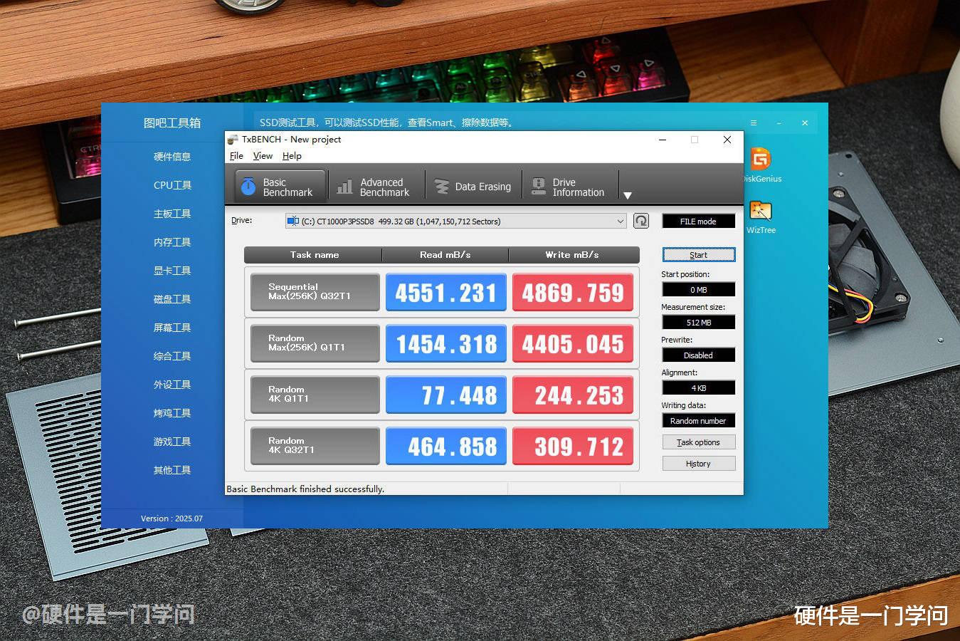 再看看自带的M.2固态硬盘速度,TxBENCH跑分,连续读取约4551MB/S,连续写入约4869MB/S,接近英睿达官方宣传的5000MB/S速度了。