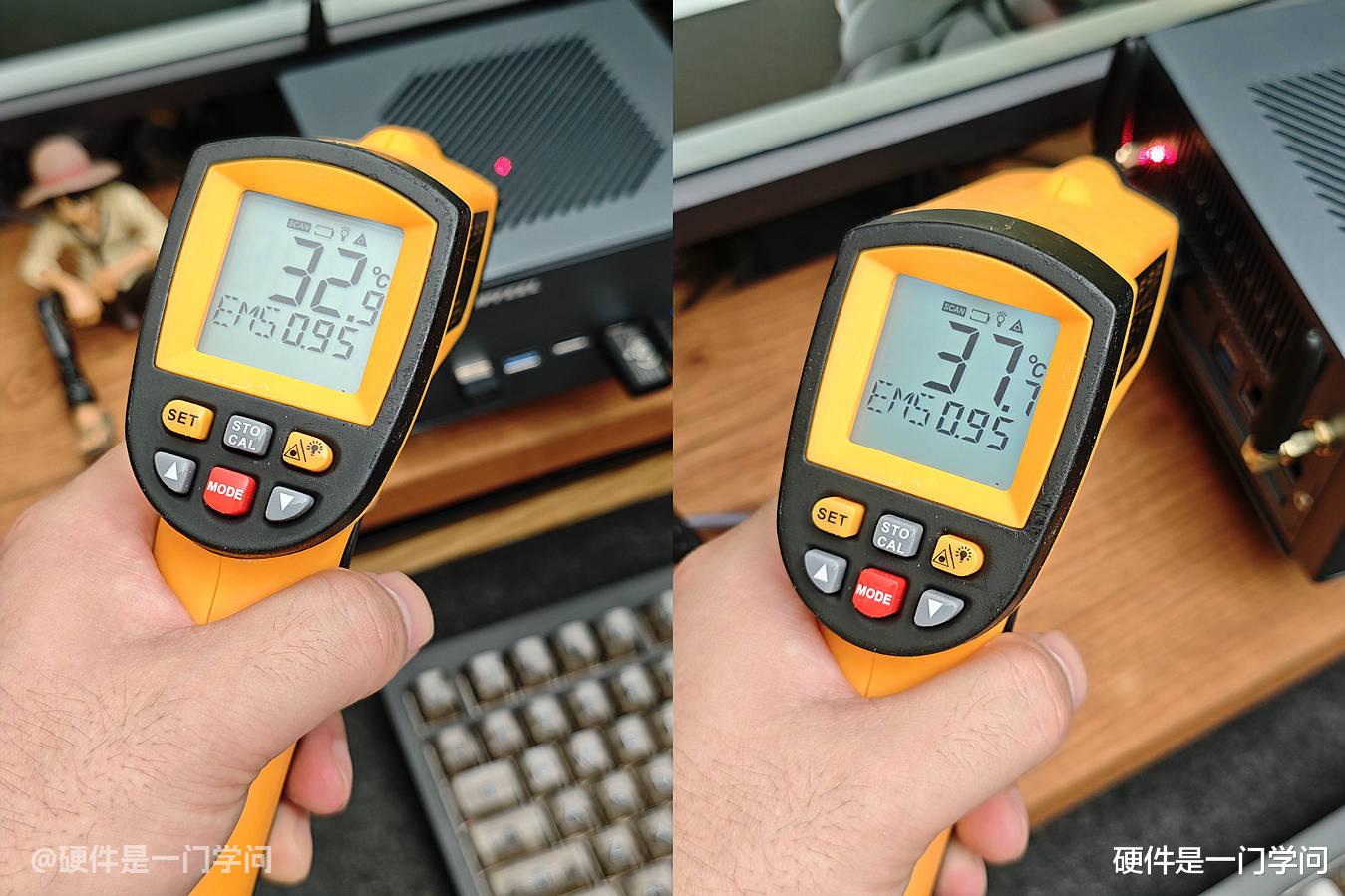 再看看主机外壳的温度,通过红外测温枪测试,顶部进风口不到33℃,其他部位不到31℃,温度最高的部位为左侧天线接口,不到38℃。