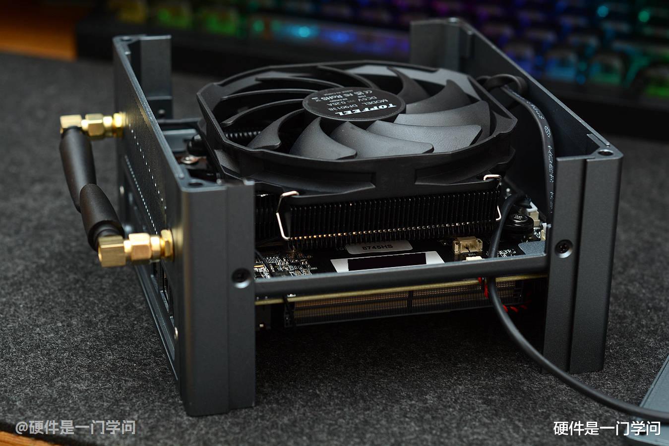再从侧面看,散热器下面为高密度加厚鳍片、回流焊4铜管,以及加厚的铜底。透过散热器鳍片,能够看到印有8745HS的标签。