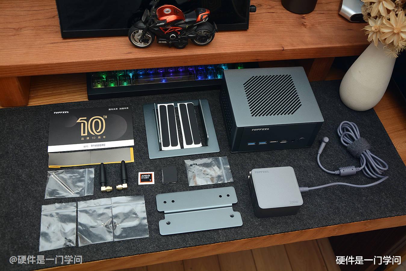 T8130M的全家福,包含十周年VIP服务卡、内存滤波片、铝合金底座、防滑垫、迷你主机、小辣椒Wifi天线、AMD标贴、铝合金壁挂架、各种备用螺丝以及100W氮化镓电源。电源采用折叠插头设计,20V、5A输出,尺寸70mm×70mm×33mm,跟一般的氮化镓充电头差不多大,客服承诺后续会出非折叠插头,可以退换,希望可以顺便把瓦数再增大一点。另外,我看到其他准系统的买家,附件里还有一对硬盘散热马甲,整机版里好像没有。
