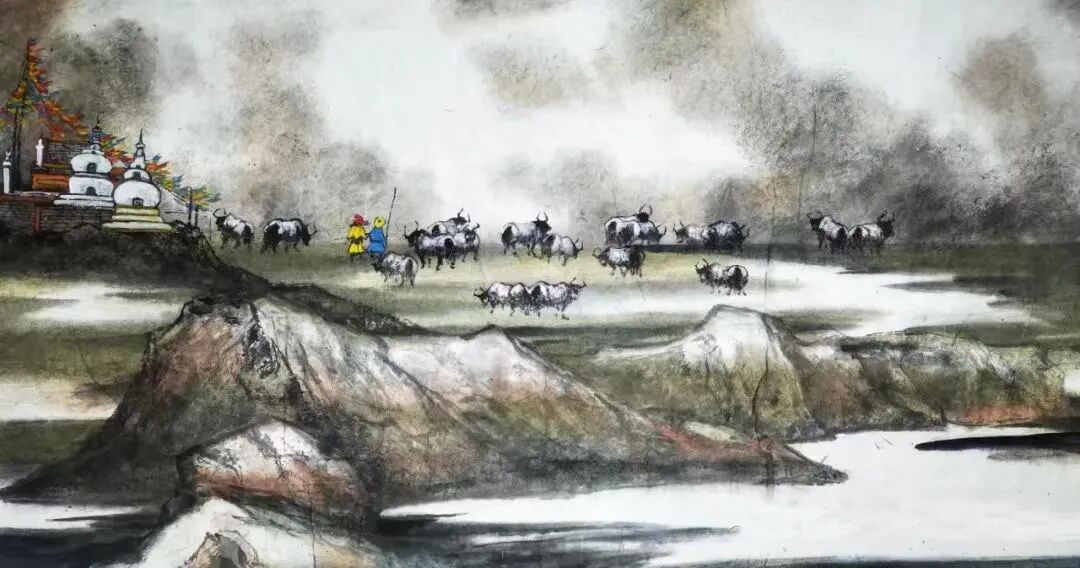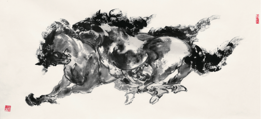 在构图上,刘大林突破了传统绘马“单马独立”“群马并列”的模式,善用“计白当黑”的留白之法,结合现代构成的疏密对比,营造出意境悠远的画面空间。其作品《踏云行》,画面中仅绘一匹奔马,偏居右侧,四蹄踏于淡墨晕染的“云气”之上,左侧大片留白,仅以数笔淡墨勾勒远山轮廓,虚实相生间,既显出马的“纵横万里”之势,又营造出“天马行空”的空灵意境。这种构图,既保留了文人画的简约之美,又符合当代人的审美习惯,让传统题材焕发新生。
