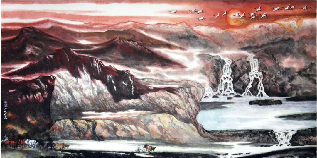 在精神内核上,刘大林的画马之作,紧扣时代脉搏,彰显着当代人的精神追求。他笔下的马,既有传统骐骥的刚健进取,又有当代人所崇尚的自由、独立与担当。在《征途》中,他绘九匹火马并肩奔驰,笔墨铿锵,气势如虹,既暗合“九骏”的传统文化意象,又象征着当代人众志成城、砥砺前行的奋斗精神;在《归牧》中,他绘一匹老马缓步徐行,身旁牧笛轻吹,笔墨舒缓,意境平和,既表现出马的温顺与从容,又寄托了当代人对宁静生活的向往。
