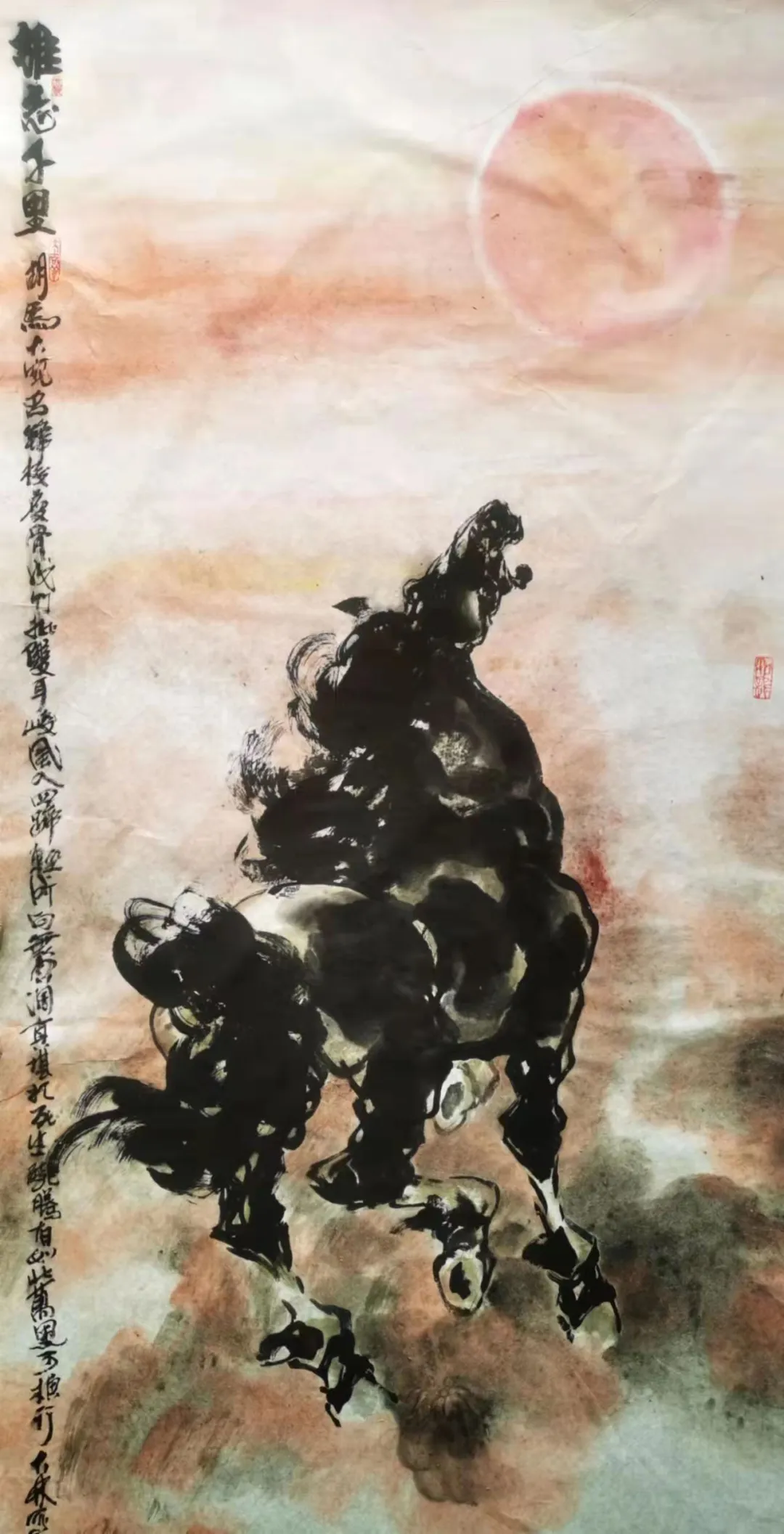 画赤马,他以朱砂调墨,略施赭石,墨色与红色交融渗透,既显出火马的热烈奔放,又通过墨色的浓淡变化,勾勒出马身的肌肉起伏,远观如烈火燎原,近看则肌理分明;画黑马,他以焦墨立骨,淡墨晕染,枯笔点苔,既表现出黑马的沉稳矫健,又通过鬃尾的飞白笔触,赋予其灵动之气;画白马,他以淡墨勾线,留白为底,略施淡赭烘染,于简约中见丰神,尽显“白马如玉”的清雅。