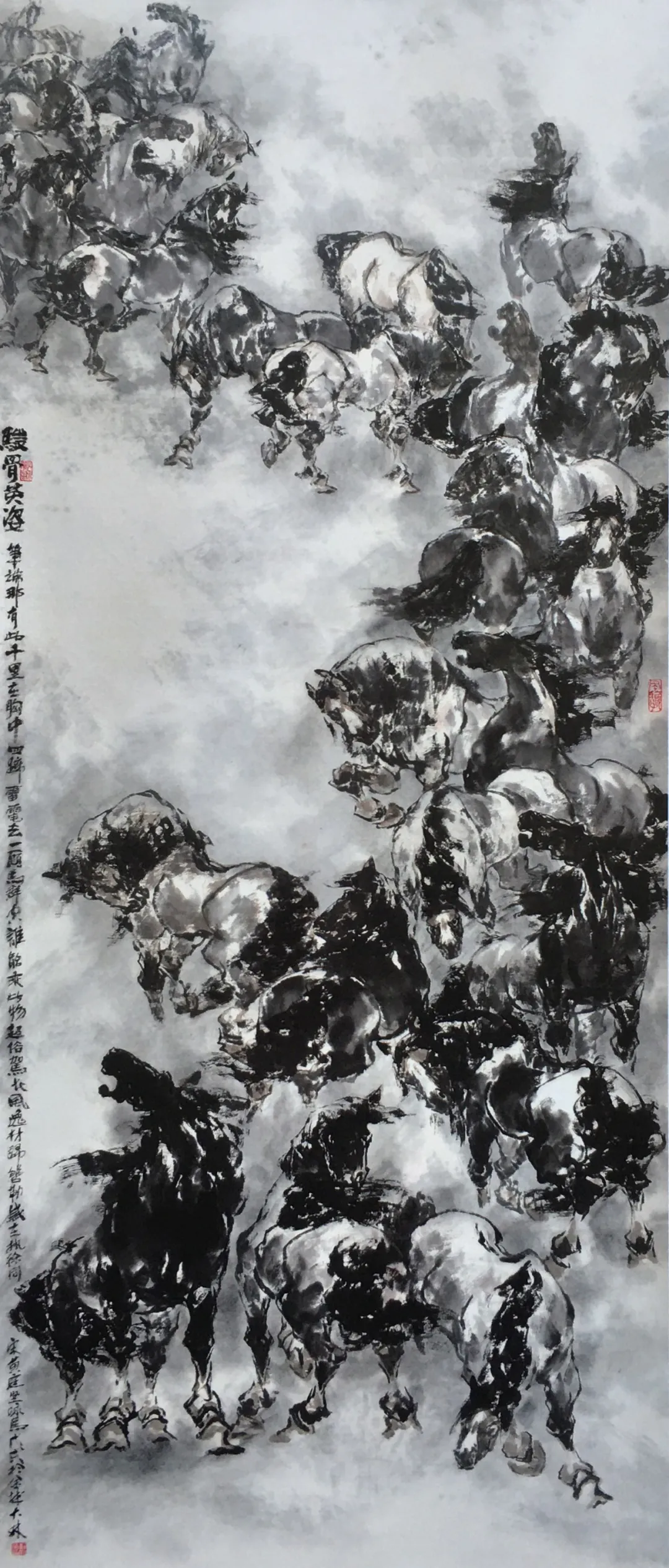 若说工笔是刘大林画马的“立身之本”,那么写意便是其“传神之魂”。他的写意马作,打破了工笔与写意的壁垒,以“兼工带写”的手法,实现了“形神兼备”的最高境界。在墨法运用上,刘大林深得“墨分五色”的奥义,将焦、浓、重、淡、清的墨色层次,与水的晕染效果完美结合,用以表现马的皮毛质感与神情气韵。