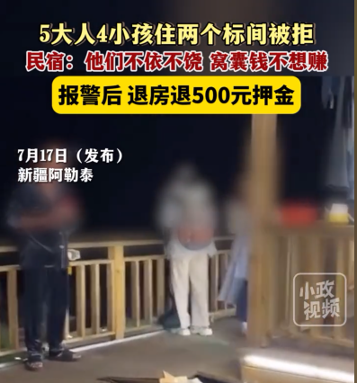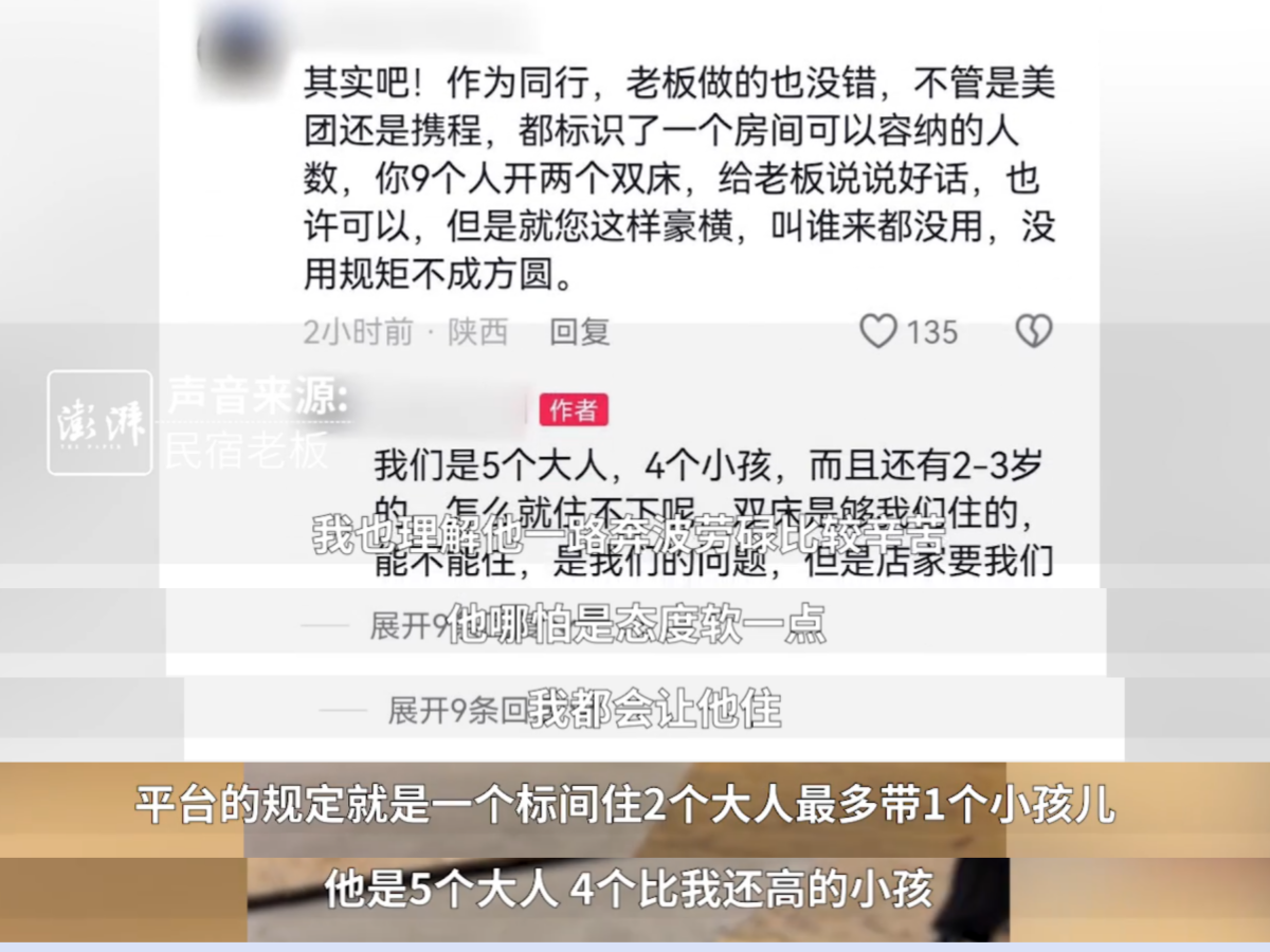 出去玩9个人住2个标间被民宿拒之门外,到底是谁不讲武德?有媒体报道,两个家庭5个大人4个小孩在平台预订2个标间,当一群人浩浩荡荡来到民宿之后,却被民宿老板要求加房才能入住。民宿老板给出的理由是:平台有规定,不得超员。游客不乐意,拍视频曝光民宿老板的行为,而老板的回应出乎意料。