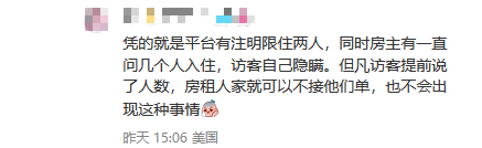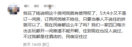 还有网友表示既然自己花钱了,就有这房间的使用权,至于自己要住几个人那时自己说的算,凭什么不给住。对此网友调侃道凭平台规定。