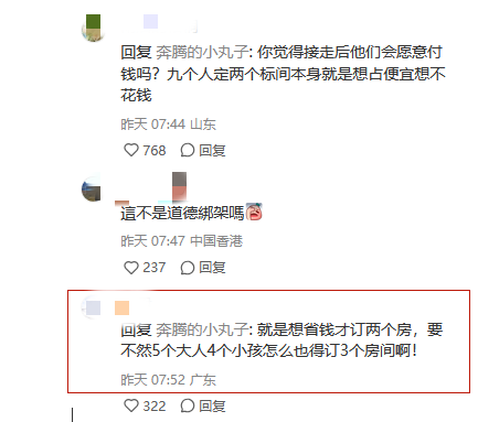 对此网友展开了激烈的讨论,有网友表示既然别人订了就要有契约精神就该让人入住,不能半夜将人拒之门外。对此网友反驳为什么不提前告知人数,不就是想省钱才订2间房,不然正常9个人至少订3间房。