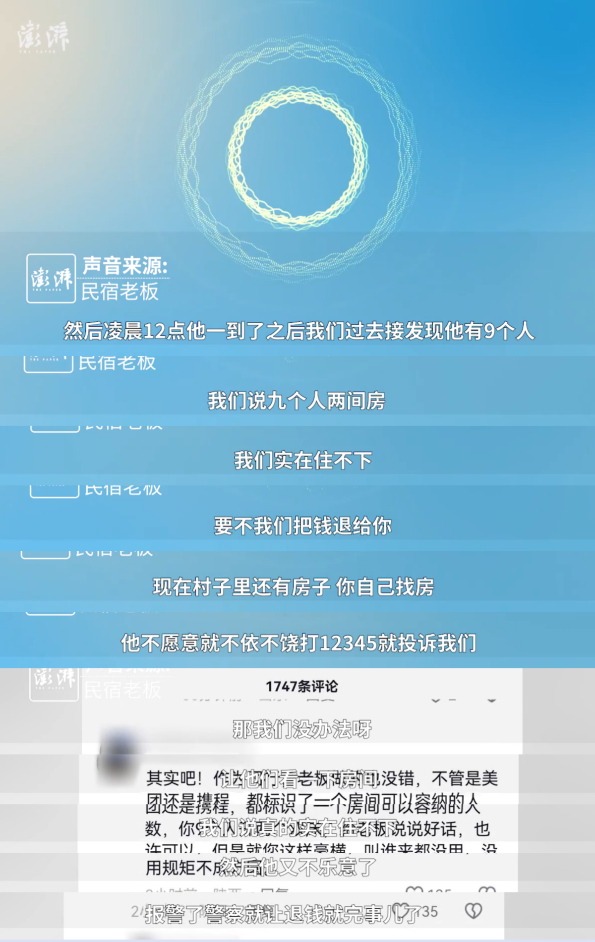 等到他们12点来办理入住手续的时候,看着9个人自己都懵了,立马向他们表示9个人住2标间住不了,至少需要再多加1间房。游客不愿意,坚称怎么住是他们的事,让我别多管闲事赶紧帮他们把手续办好了。双方产生分歧,于是我便提议把钱退给他们,让他们去村里其他民宿住,游客非常不满我的提议,嚷嚷要打12345投诉。于是我便带他们去标间看了一下,确实住不了那么多人,哪知游客仍不满,坚持表示自己不会再开一间让我把2间房开出来给他们。泥人都有三分火气,见他们油盐不进,我便提议让他们报警处理。随后游客报警了,而警察到场后建议老板退钱了事。