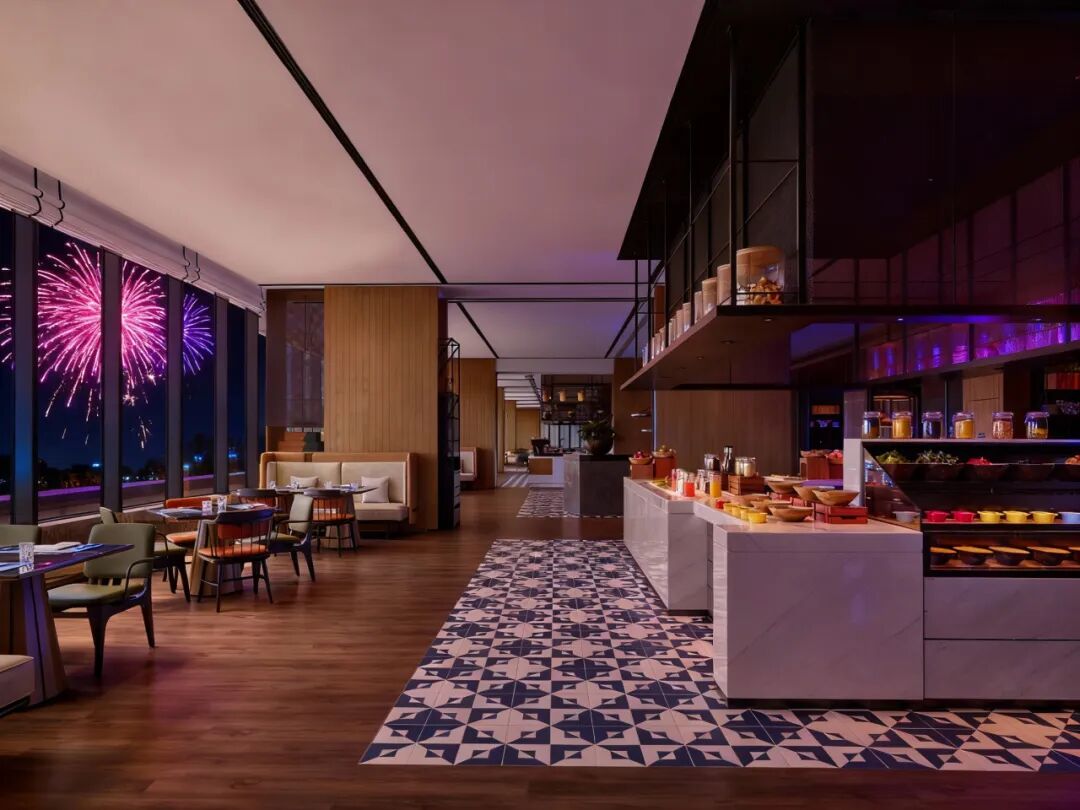 设计师将湖水流动的意象融入布局,搭配琥珀色陈设与暖色灯光,望出去是湖景日落与草木绿植,宛如置身一幅悠然典雅的自然画卷,亦将烟花秀的观赏体验拉满。