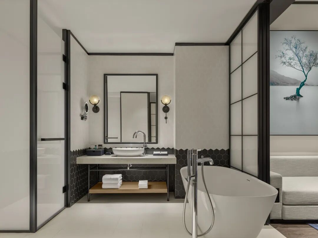 而210间现代化淀山湖全湖景客房及套房,每一间都堪称“观景宝藏”。推门而入,潋滟湖景便映入眼帘,明媚光线与室内暖色原木交相辉映,绀宇蓝的陈设点缀其间,尽显雅致格调。
