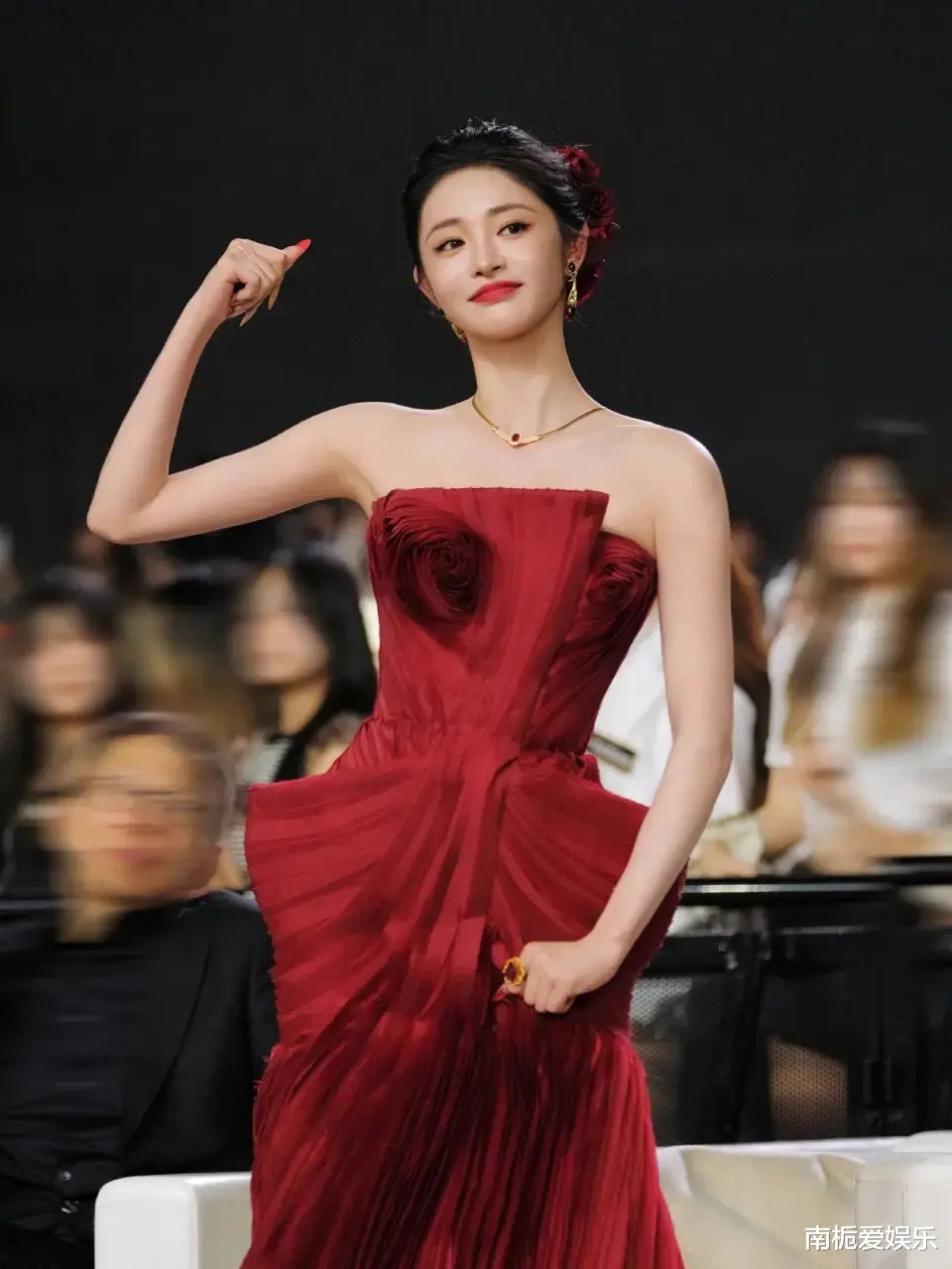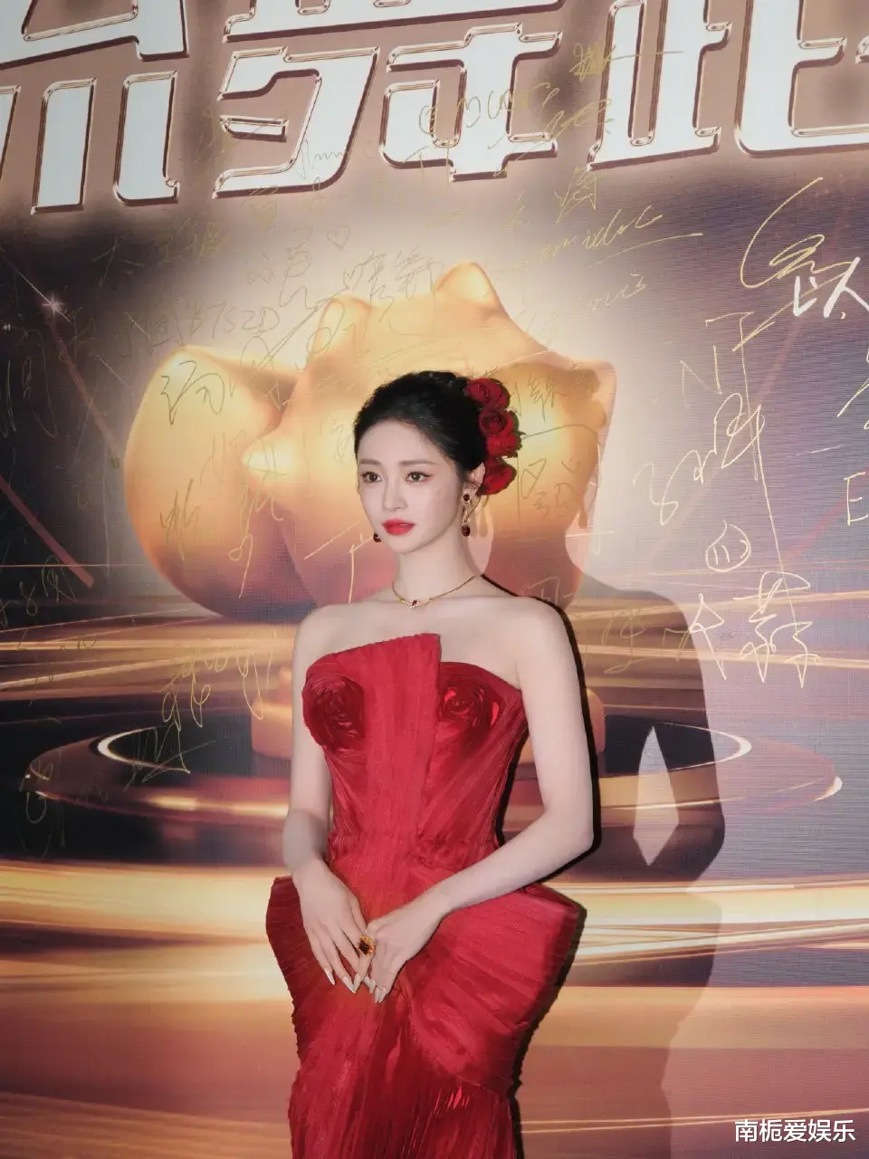 红裙采用高定缎面材质,光泽流动如水,贴合身形的剪裁勾勒出优雅曲线,叠褶设计增添层次感,行走间摇曳生姿。露肩设计大胆却不失端庄,完美展现其肩颈线条与锁骨美感。搭配高盘发造型,清爽利落的大光明设计进一步凸显她优越的面部轮廓与天鹅颈,使整体气质更显高级。鬓边轻垂的碎发柔化了造型的锋利感,增添一丝慵懒妩媚。