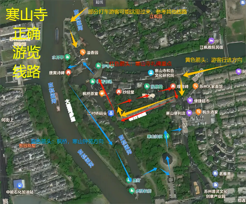 最后从寒山钟苑出口离开,全程顺畅不绕路,核心景点一网打尽!