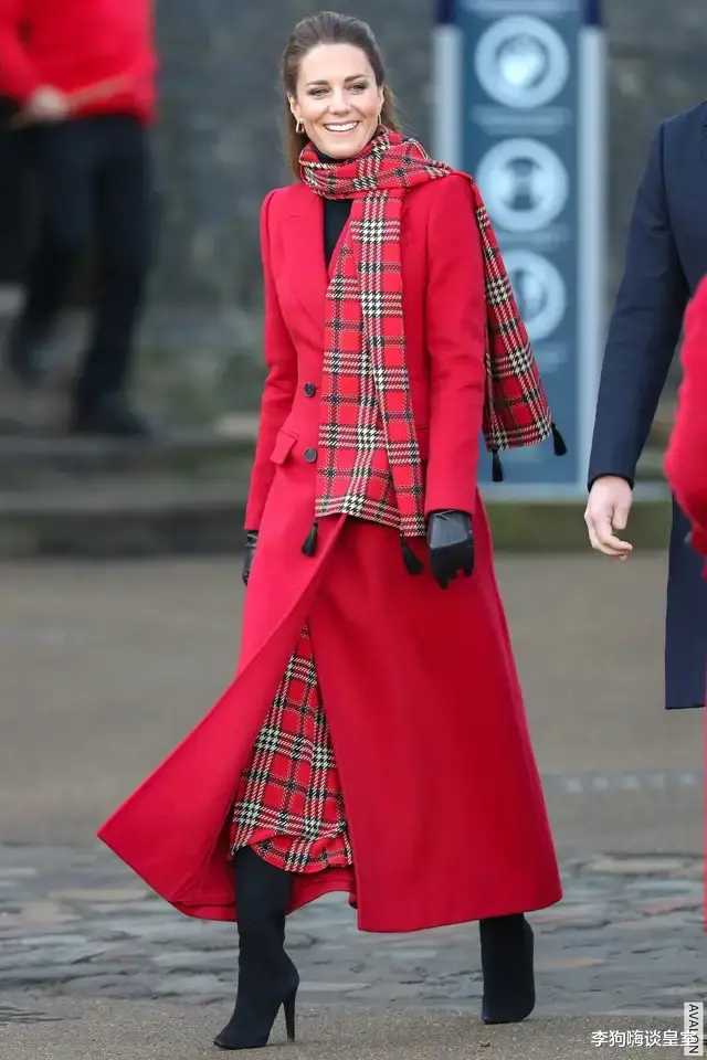 她将剪裁精美的亮红色亚历山大・麦昆(Alexander McQueen)大衣,与艾米莉亚・威克斯特德(Emilia Wickstead)的苏格兰格子超长半裙搭配,还叠穿了一条同色系围巾保暖。