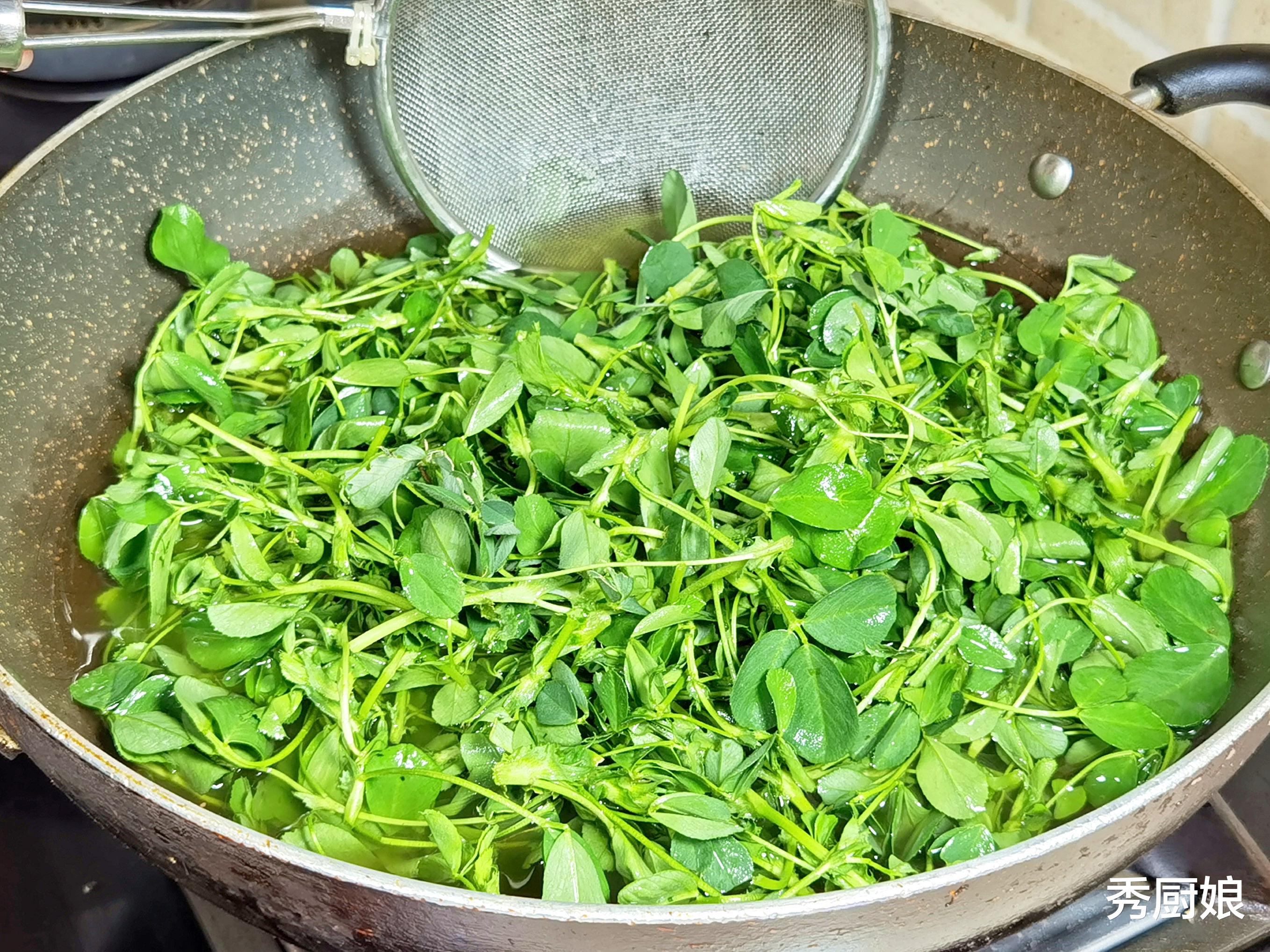 锅里烧水,水开了往里加一勺盐,再滴几滴食用油。这是焯青菜的小窍门,加盐和油能让焯出来的菜颜色更翠绿,看着就有食欲。把洗好的苜蓿倒进去,用筷子拨散,数着数,也就是烫个一分钟左右,看着它变软了、颜色更深了,立马捞出来。