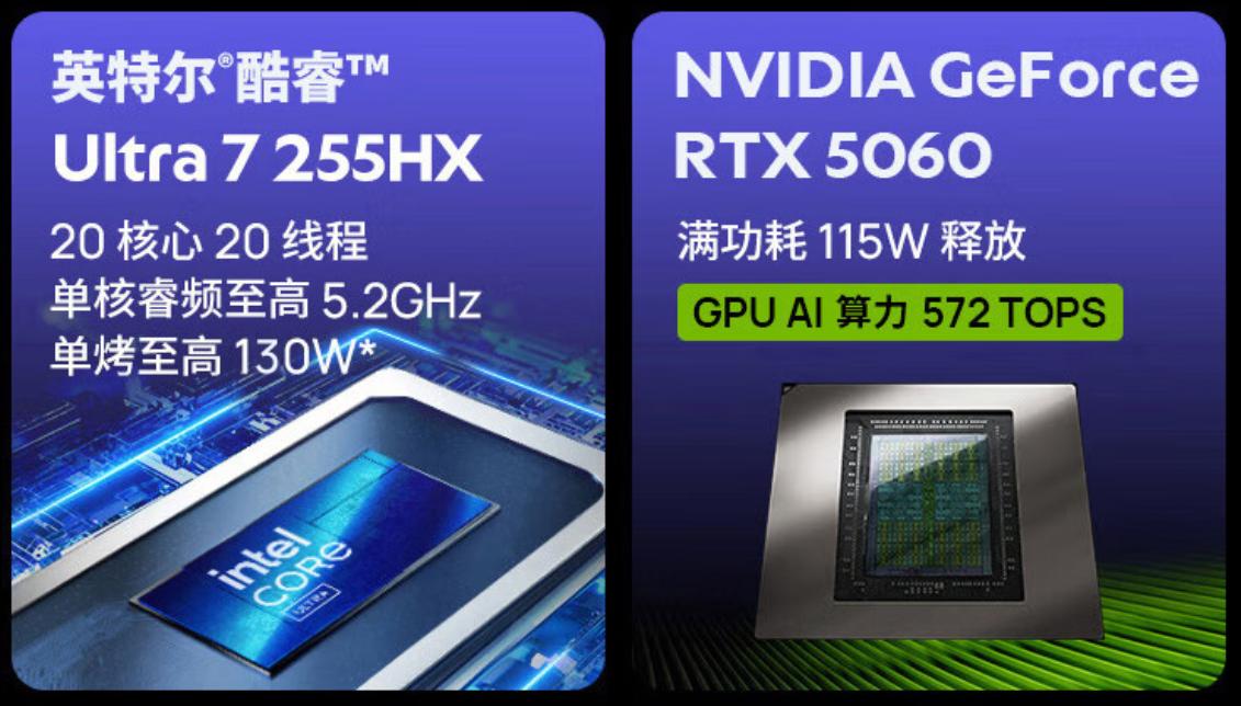 外在吸睛,内在这台机器同样不含糊。性能配置上,耀世16 Ultra的思路很清晰:处理器给足余量,显卡务实选择,内存一步到位。它搭载的英特尔酷睿Ultra 7 255HX拥有8+12核心20线程,至高睿频5.2GHz,单烤功耗释放达到140W,CINEBENCH R23多核跑分32133,应对各类生产力和游戏场景都绰绰有余。显卡选用NVIDIA GeForce RTX 5060笔记本电脑GPU,支持572 TOPS AI算力和DLSS 4.5技术,高帧率游戏体验得以充分保障。配合32GB内存与1TB PCIe 4.0固态硬盘,日常使用中的多任务切换和游戏加载都能保持迅速响应。