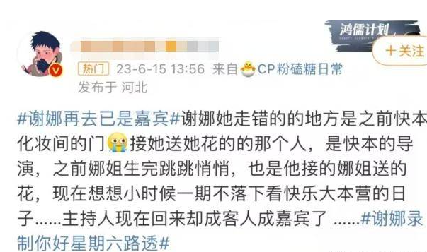 当所有人都不能接受快本一去不复返的时候,何老师带着一群人推出了一档名为你好星期六的新节目,渐渐地,快乐大本营这个名字也渐渐淡出了人们的视线。在新一期的节目里,王鹤棣和檀健次的精彩表演为新一期的栏目带来了新的活力,何老师一如既往地对每个嘉宾都是一副大家长的样子,而在六月十五日,有网友发现,谢娜竟然也在录制你好星期六。这一次谢娜要回到她最熟悉的舞台,她不知道自己应该以什么样的形象出现在舞台上,也不知道节目组要找谢娜做什么,又或者只是想让谢娜和何老师在一起。谢娜一进门,就有一个举动,让很多粉丝都忍不住破防,她想要去更衣室,但是她下意识的走向了主持人的更衣室,而节目组的人立马就把她叫住了她才意识到自己走错了,她的这个举动,让很多人都意识到曾经的他们真的不可能再回来了!