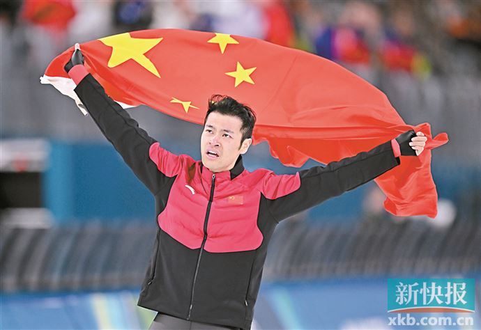 2月19日,宁忠岩在赛后身披国旗庆祝。新华社发