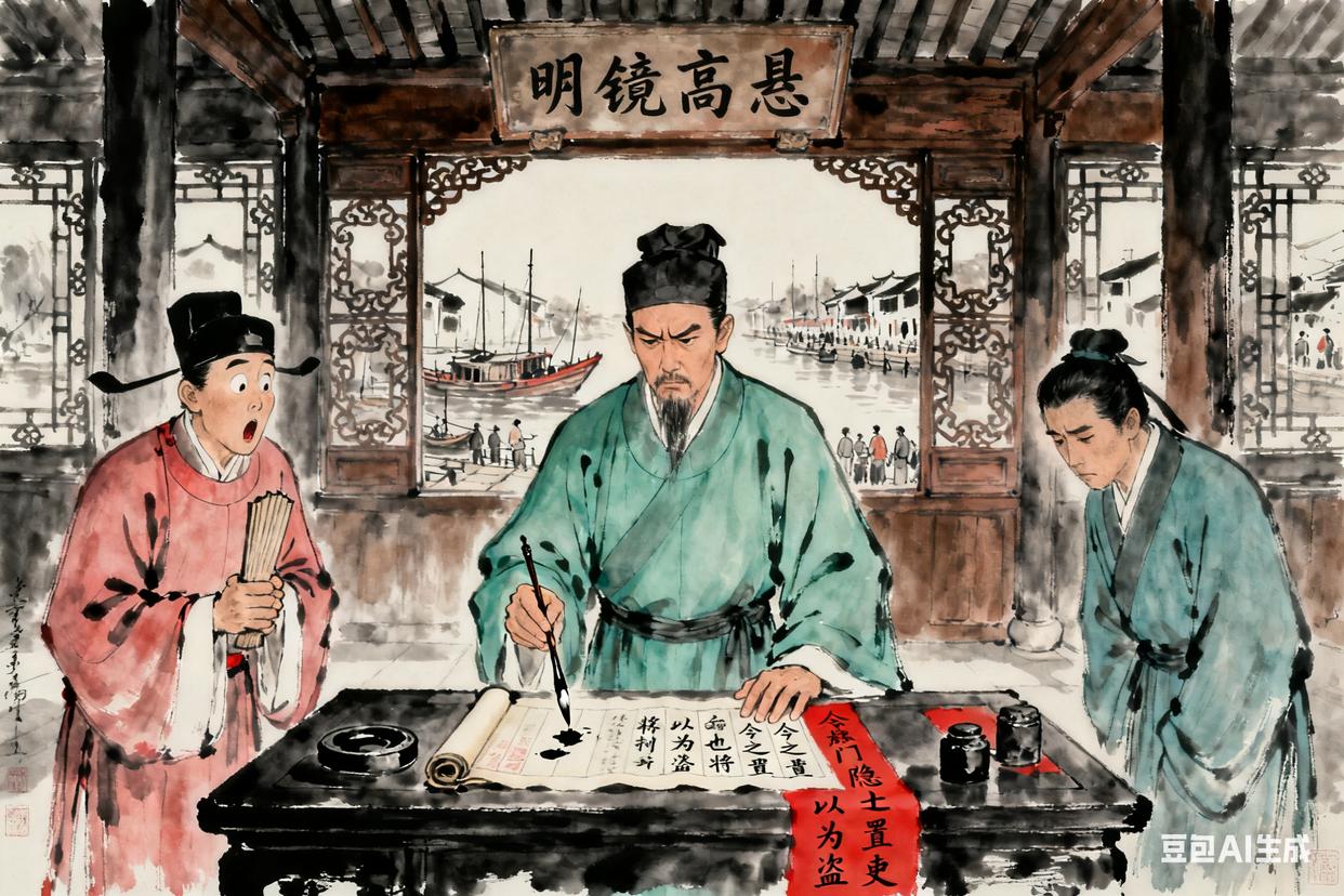 笔落惊堂,墨溅寒霜。咸通九年(868年)的苏州官衙,秋阳透过雕花窗棂,在青石板上投下斑驳的光影。三十三岁的皮日休身着青绿色进士袍,指节因紧握狼毫而泛白,案上摊开的判词墨迹未干,“古之置吏也将以逐盗,今之置吏也将以为盗”的字句,如一把淬了冰的匕首,狠狠扎进满堂官员的沉默里。左侧的苏州刺史下意识攥紧笏板,袍角在袖中微微颤抖;右侧的录事参军垂首盯着地面,不敢与皮日休锐利的目光相接——彼时的苏州,虽顶着“东南富庶地”的名号,码头边却挤满了卖儿鬻女的流民,而官衙内的官吏,仍在借着“苛捐杂税”中饱私囊,这份判词,恰是捅破这层虚伪的第一缕光。