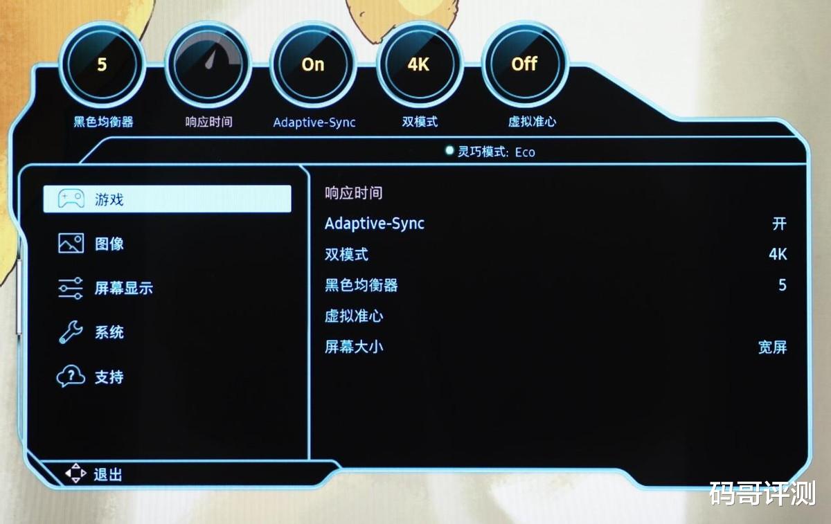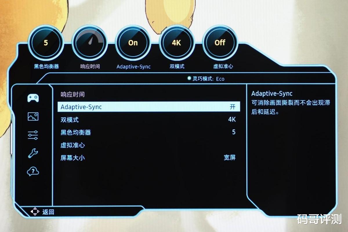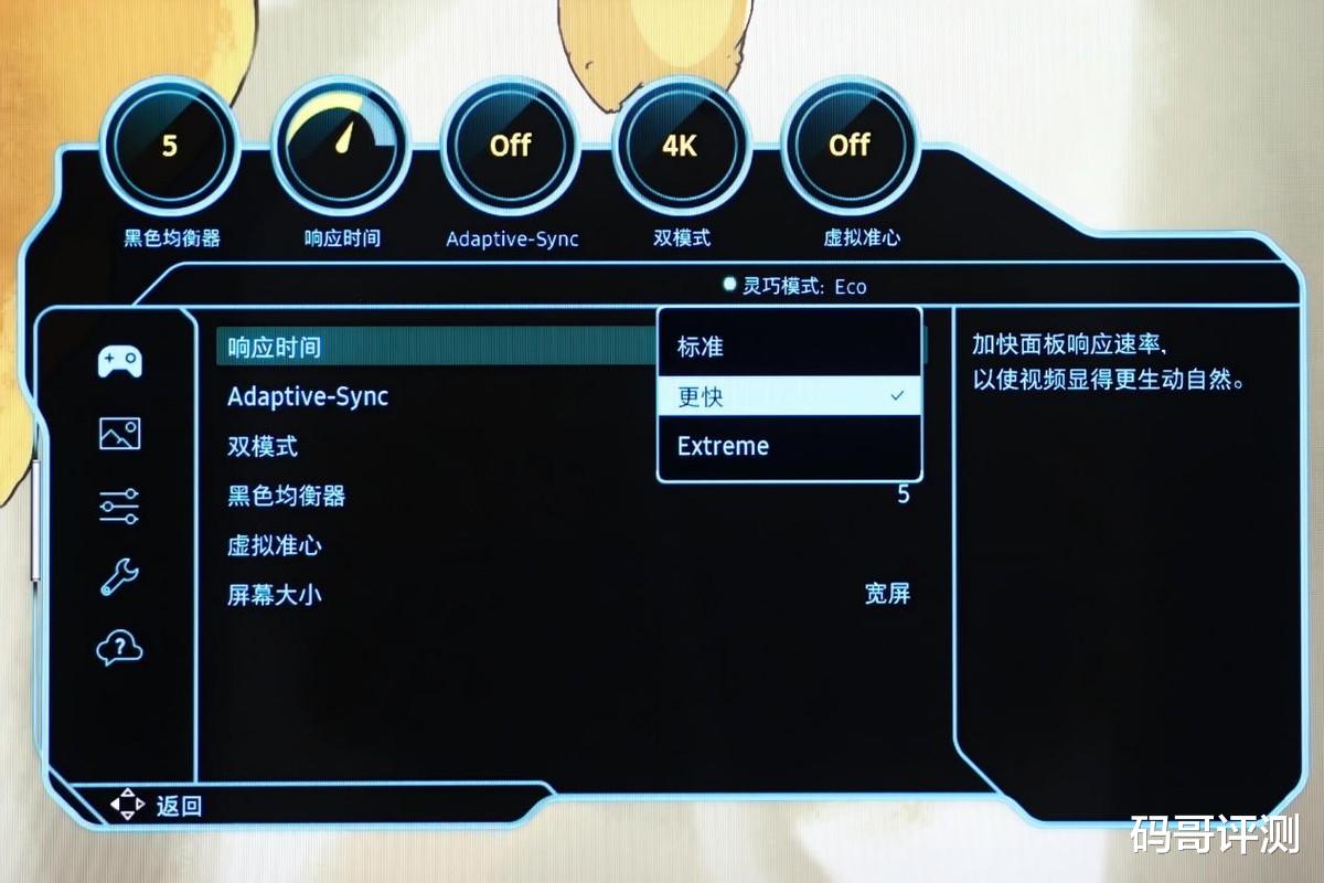 需要注意一点,三星G70F默认开启VRR(可变刷新率),对应的是设置中的“Adaptive-Sync”功能,它可以减少画面卡顿、延迟和图像撕裂现象,不过此时的响应时间是无法调节的,如果你想调节,需要先关闭这个“Adaptive-Sync”功能。