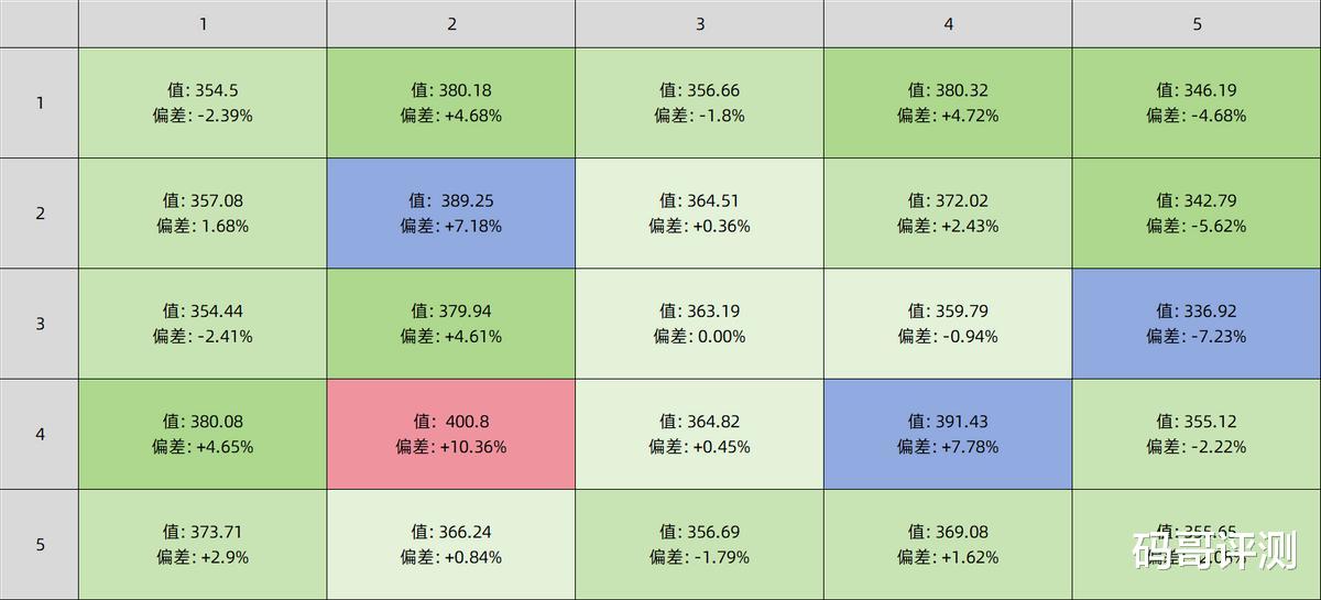 在亮度均匀性上,三星G70F超过10%亮度偏差的只有一个,超过7%的有3个,绝大多数区域的亮度偏差都能控制在5%以内,整体的表现也很不错。