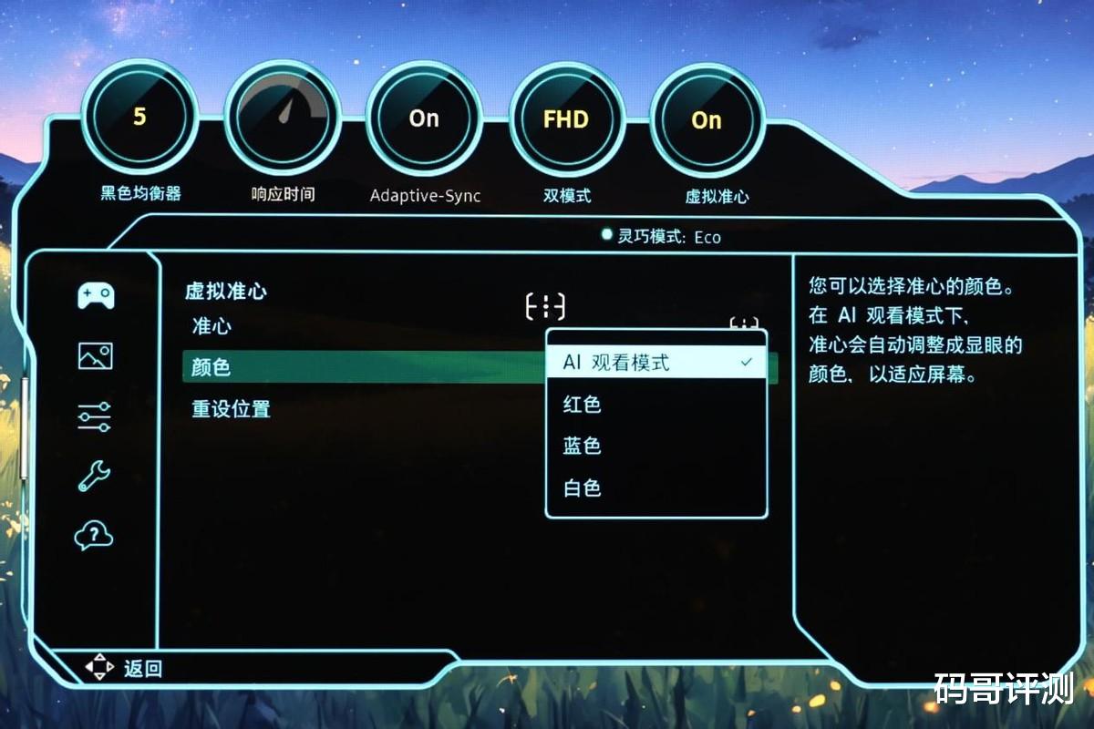 虚拟准心可以说是电竞显示器的标配了,三星G70F也没有例外,而且它的准心颜色还提供了一个AI观看模式,此模式下准心会根据屏幕显示的内容,自动调整成显眼的颜色。