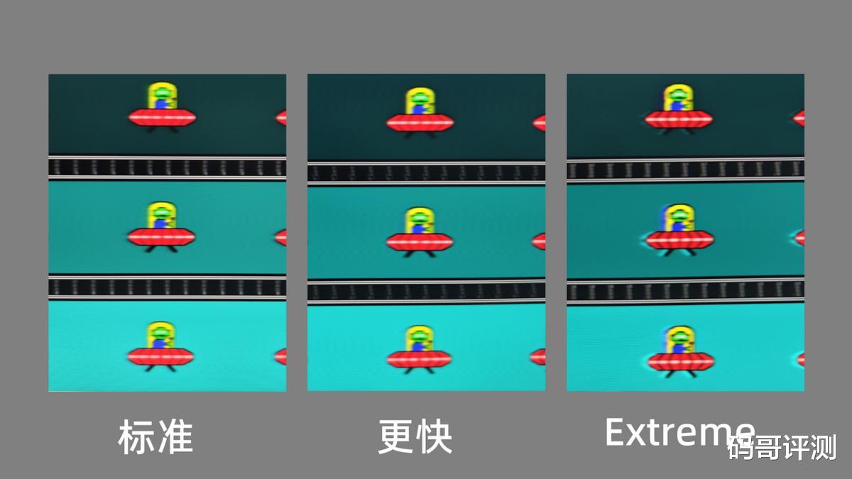 响应速度方面,在4K 180Hz模式下,三星G70F提供了三个OD档位,实测最佳OD档位是默认的“更快”,相比于“标准”档位拖影控制得会更好一点,“Extreme”档的画面虽然没有拖影,但是出现了过冲鬼影,属于不可用档位,到手后想要设置OD档位建议选择“更快”。