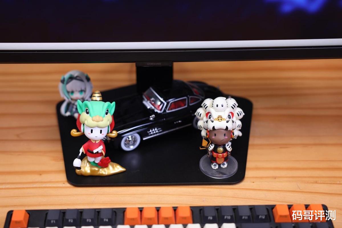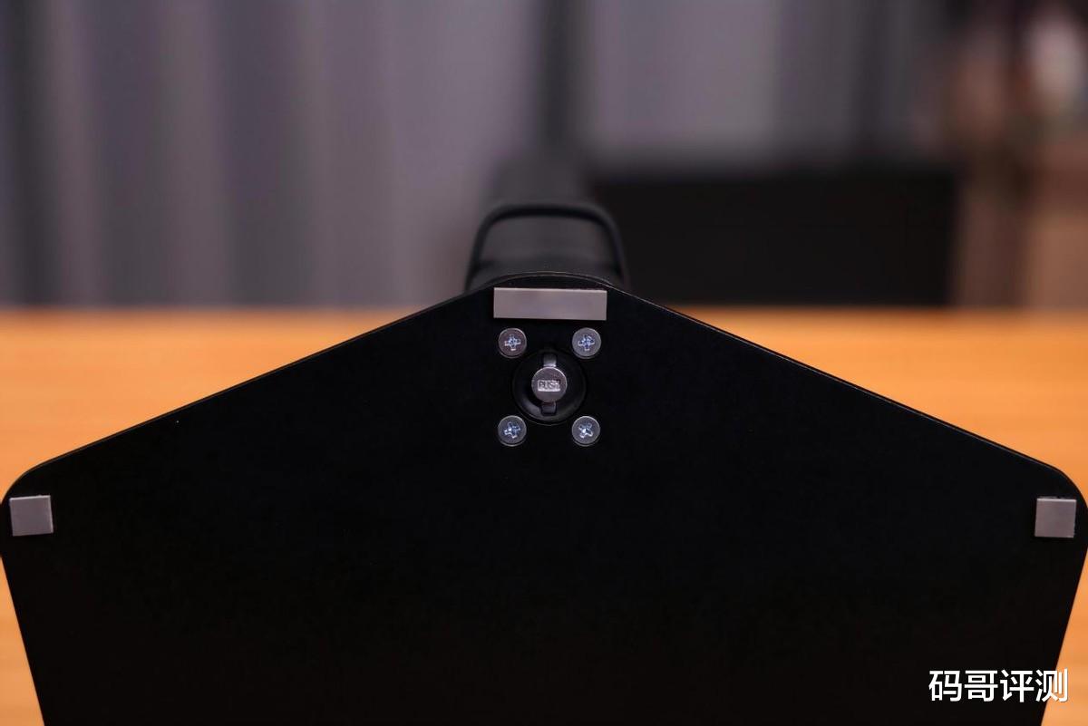 底座是金属材质的五边形平板设计,下方还贴有防滑脚垫,放在桌面上很牢靠,上面的空间也能很好地利用,放些手柄、手办、小音箱等桌搭都是可以的,但对于桌面非常窄的用户,这个底座的尺寸还是需要谨慎考量。