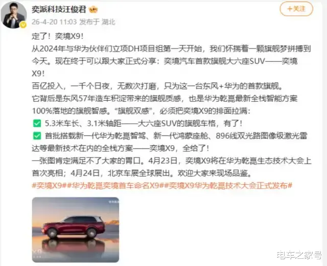 日前,电车之家获悉奕境品牌首款车型定名奕境X9,同时该车会在即将举办的北京车展上亮相。
