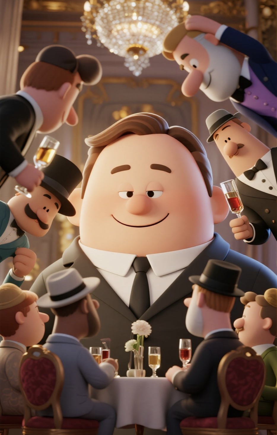 这时一个满身“珠光宝气”的胖子举着酒杯站了起来。
