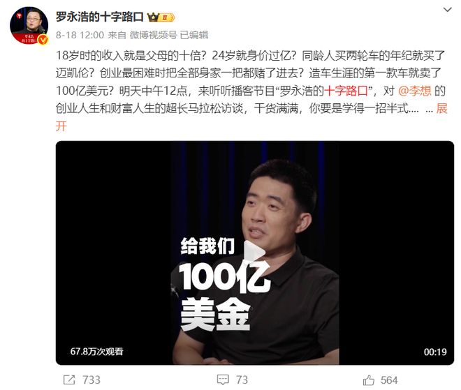 比如,罗永浩首期播客邀请理想汽车创始人李想进行近4小时的深度对话,李想在节目中罕见哽咽,讲述创业历程中王兴雪中送炭的经历,以及理想MEGA被恶意抹黑为“棺材车”的遭遇。相关话题迅速登上热搜,大众共情创业者心理压力的同时,对罗永浩的关注度也在攀升。