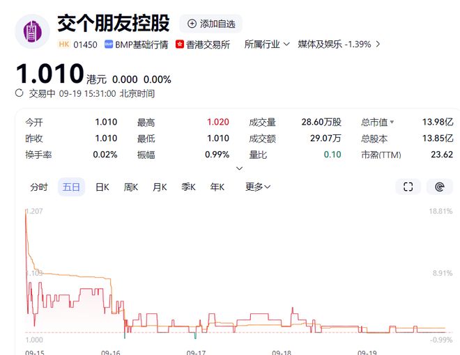 9月10日罗永浩吐槽西贝后,9月12日,也就是第二个交易日,交个朋友控股股价从0.95港元开盘,最终收于1.01港元,涨幅达6.32%;9月15日股价继续攀升至1.07港元,涨幅5.94%,两个交易日内累计涨幅超12%。