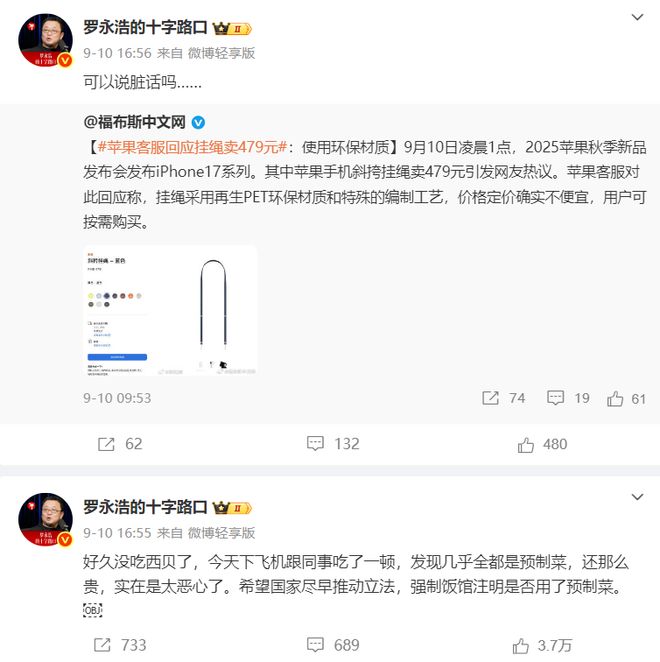 在吐槽完西贝一分钟后,罗永浩就转发了一则“苹果客服回应挂绳卖479元”的消息称,“可以说脏话吗”……一个多小时后再次发相关微博,同样用到了“割粉丝韭菜很恶心,吃相很难看”等激烈言辞。