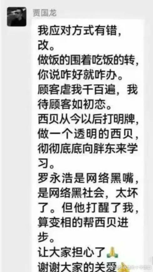 9月13日,社交媒体上流传一张来自贾国龙的内部发言截图,称罗永浩是“网络黑嘴”“网络黑社会”。截图里,他一边承认“应对方式有错,改!”,宣布要“打明牌学胖东来”,一边又忍不住放狠话,“太坏了,但他(罗永浩)打醒了我”。