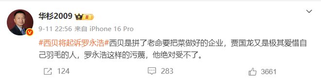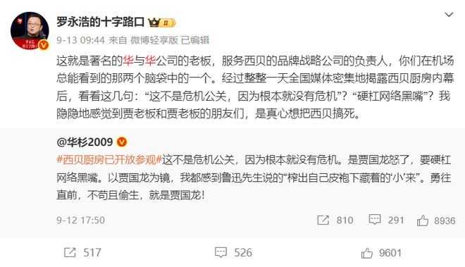 战火愈演愈烈。同在9月11日晚,华与华董事长华杉也公开下场站队,发布多条微博力挺贾国龙,让事件进一步升级。大众舆论迅速分裂成两派,贾国龙与华杉的过往经历也被逐一翻出、重新审视。