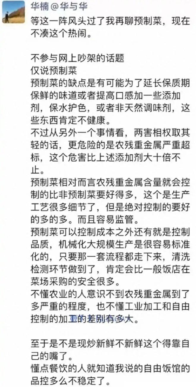面对危机,华与华非但没从食品安全角度安抚情绪,反而夸赞西贝,更有媒体报道称,华楠发朋友圈表示,“预制菜缺点,有些添加剂肯定不健康,但比起农残和重金属,预制菜控制得更好”。