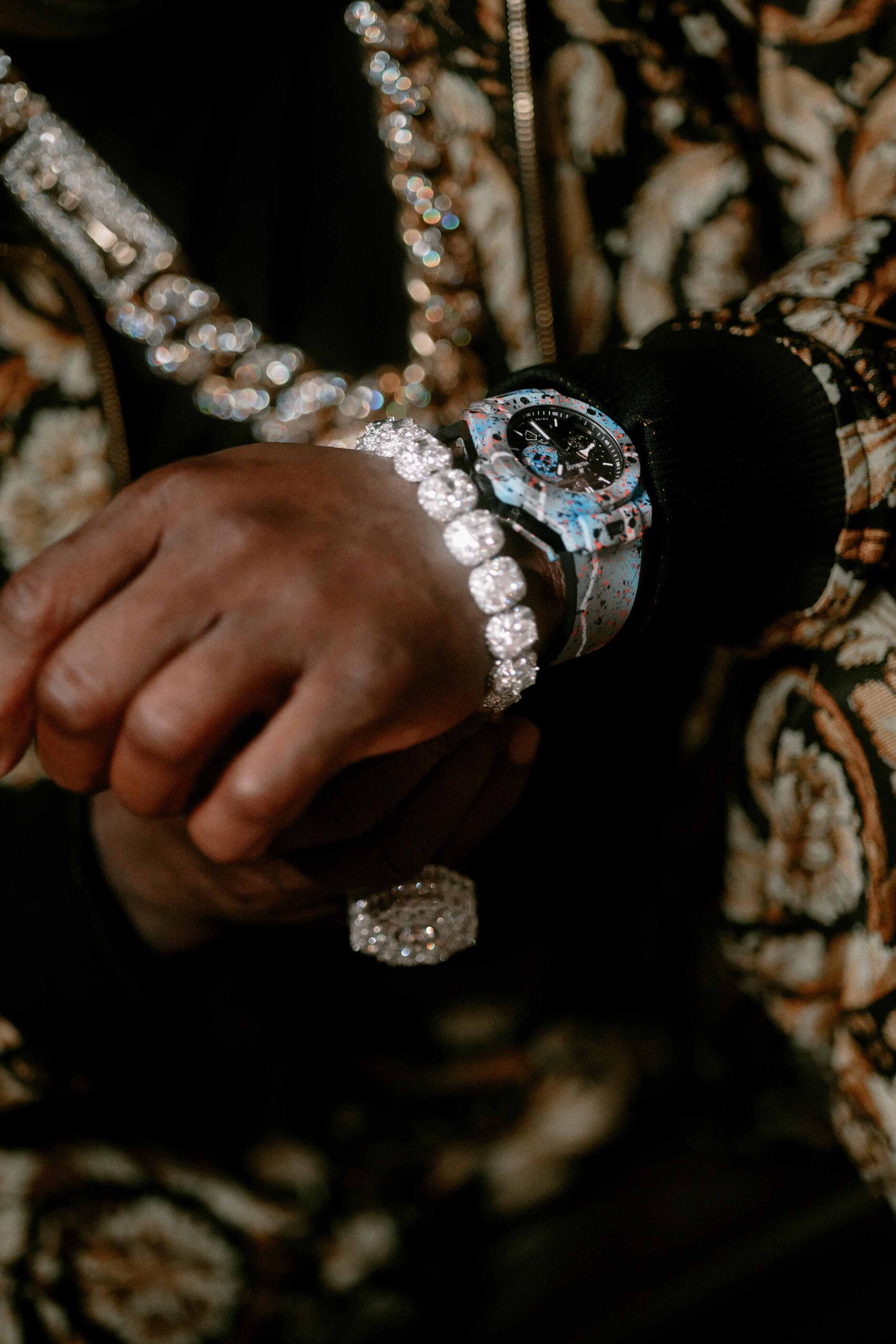 发布会选址颇有深意。迈阿密海滩艾迪逊酒店(The Miami Beach EDITION)地下那间传奇的Basement俱乐部,本身就是夜生活与先锋文化的交汇地带。HUBLOT宇舶表在此构建了一个多层空间,灯光、音乐、人群交织其间。当晚最引人注目的时刻,属于说唱巨星50 Cent腕间那枚专属定制的孤品腕表——表盘上镶嵌着金色棋子图案,呼应他旗下Le Chemin du Roi香槟品牌的视觉符号。这种将个人叙事浓缩于方寸机械之中的做法,正是HUBLOT宇舶表一贯擅长的手法。