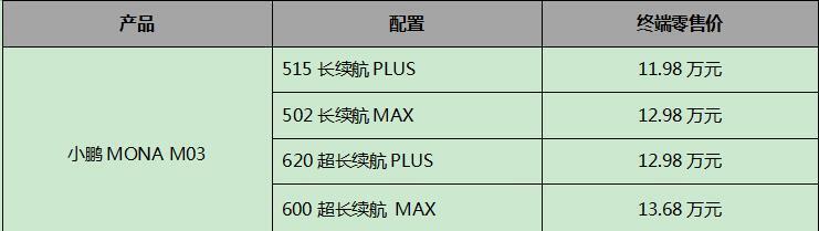 相对而言,小鹏MONA M03也有四种续航,从低到高分别为502km、515km、600km和620km,这其中的差距还是比较明显的。