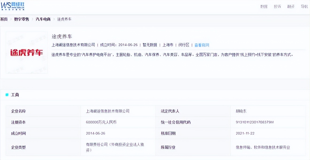 据网经社企业库显示,途虎养车隶属于上海阑途信息技术有限公司,法定代表人为胡晓东,成立时间为2014年6月26日。