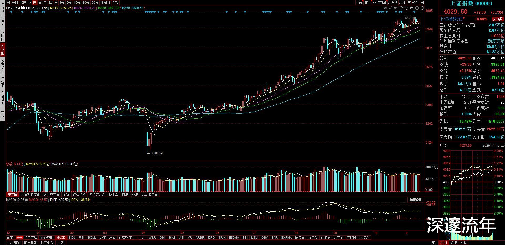 2025 年 11 月 13 日,上证指数以 2.2% 的涨幅强势突破 4000 点整数关口,单日成交额时隔三月重返 2 万亿元大关。