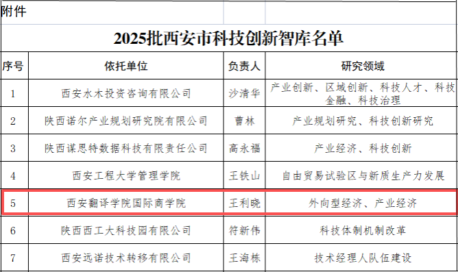 10月20日,西安市科学技术局发布的《关于确定2025批西安市科技创新智库的通知》正式公示结果,经研究确定40家依托单位为2025批西安市科技创新智库。由国际商学院报送的“内陆口岸经济与运营研究智库”成功入选,凸显了我校在深入实施创新驱动发展战略、统筹智力资源,更好服务市委、市政府乃至全省科技创新建言献策方面的支撑作用。